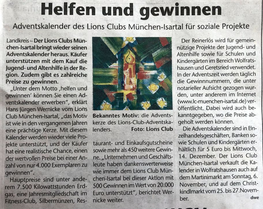 Ein Schwerpunkt unseres sozialen Engagements und unserer Hilfeleistungen liegt seit Bestehen des Clubs in unserem regionalen Umfeld. Diesen Schwerpunkt haben wir mit der Aktion Adventskalender noch wesentlich verstärkt.